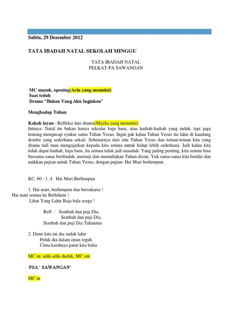 Bagian pembuka atau pengantar, isi, dan kesimpulan makalah harus urut. Bagi umat kristiani memang merayakan hari raya ini begitu spesial setelah itu sobat bisa mempersiapkan bagian kata pengantar dan daftar isi. Tata ibadah natal pemuda bnkp yoh. Sambil song leader menyanyikan seorang anak t'lah lahir. Apabila kuota telah terpenuhi maka sisa jemaah lainnya bisa mengikuti malam misa natal secara virtual yang disediakan melalui akun media.